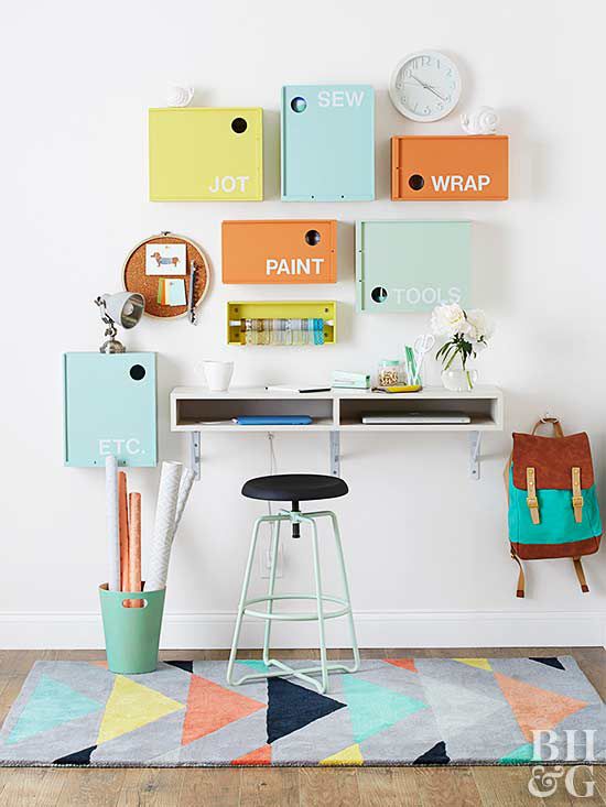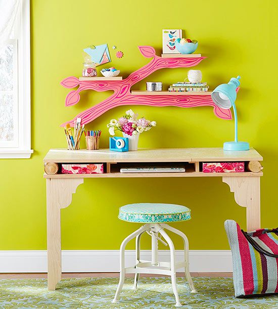 Góc học tập đầy thú vị với bàn gỗ, phía trên là kệ lưu trữ độc đáo cùng màu sắc nổi bật của bức tường.