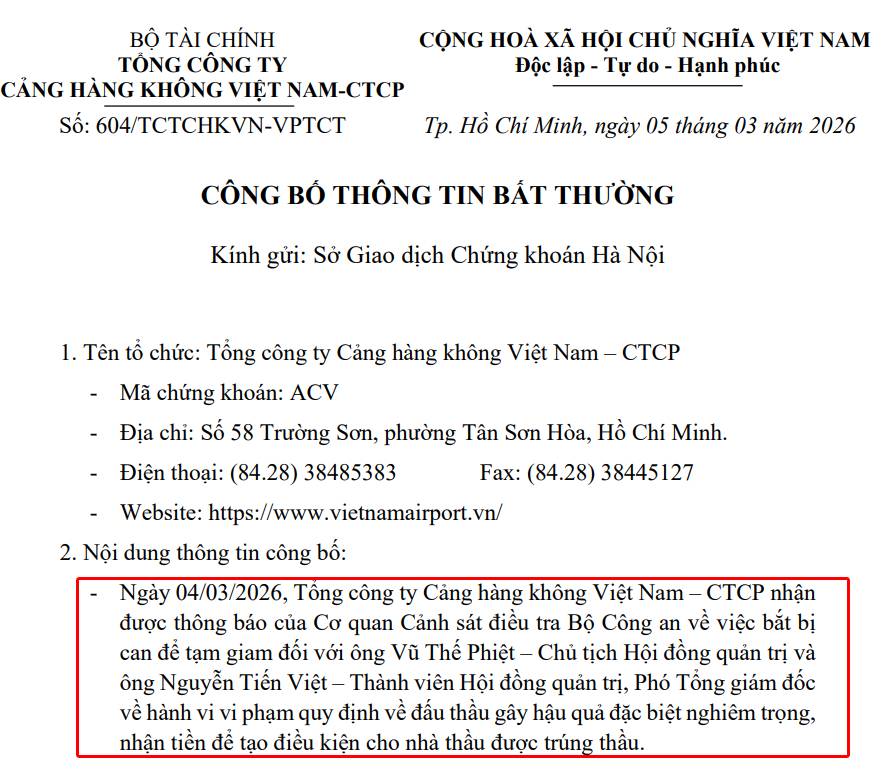Theo đó, ngày 4/3, ACV nhận được thông báo của Cơ quan Cảnh sát điều tra Bộ Công an về việc bắt bị can để tạm giam ông Vũ Thế Phiệt, Chủ tịch HĐQT và ông Nguyễn Tiến Việt, Thành viên HĐQT, Phó tổng giám đốc về hành vi vi phạm quy định về đấu thầu gây hậu quả đặc biệt nghiêm trọng, nhận tiền để tạo điều kiện cho nhà thầu được trúng thầu.