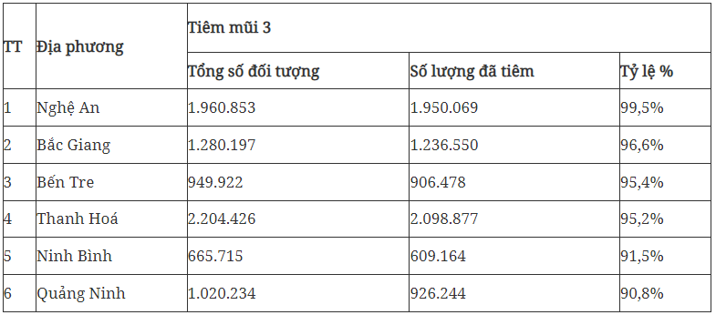 Tuy nhiên, các ý kiến tại phiên họp cũng đánh giá việc tiêm chủng vaccine vẫn chưa đạt mục tiêu đề ra; tốc độ tiêm vaccine COVID-19 ở một số địa phương không đạt tiến độ, nhất là tiêm mũi 3, mũi 4 và tiêm cho trẻ từ 5 đến dưới 12 tuổi. Bên cạnh đó, một số địa phương có tỉ lệ tiêm mũi 3, mũi 4 cho người từ 18 tuổi đạt tỉ lệ cao, như bảng sau: