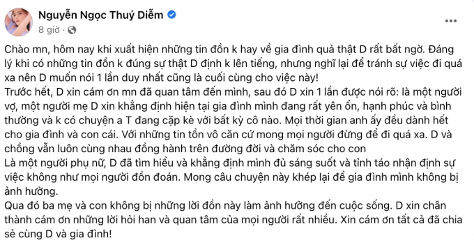 Cụ thể, Thúy Diễm viết: "Diễm xin một lần được nói rõ. Là một người vợ, một người mẹ, Diễm xin khẳng định hiện tại gia đình mình đang rất yên ổn, hạnh phúc và bình thường và không có chuyện anh Thành đang cặp kè với bất kỳ cô nào. Mọi thời gian anh ấy đều dành hết cho gia đình và con cái. Với những tin đồn vô căn cứ mong mọi người đừng để đi quá xa. Diễm và chồng vẫn luôn cùng nhau đồng hành trên đường đời và chăm sóc cho con".