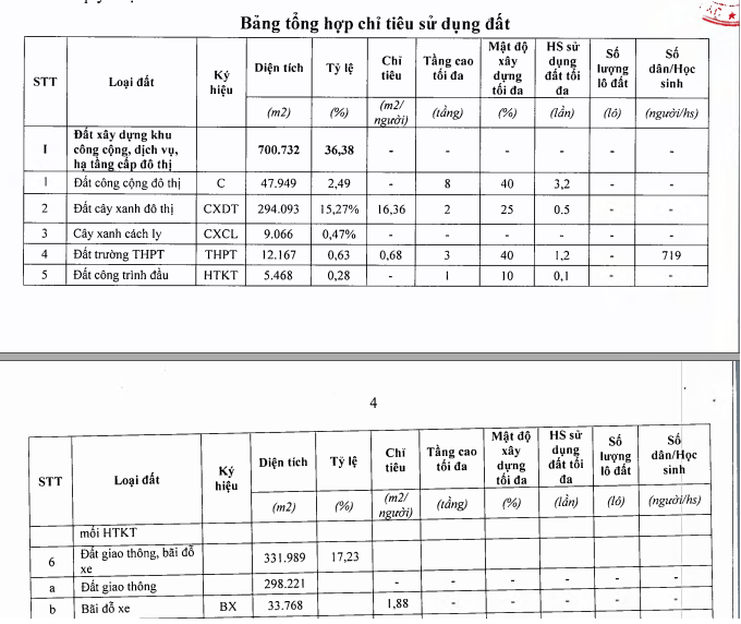 Cơ cấu sử dụng đất toàn khu đô thị: Đất ngoài đơn vị ở diện tích 700.732m2, chiếm tỷ lệ 36,38% đất khu; Đất đơn vị ở diện tích 1.225.676m2, chiếm tỷ lệ 63,62% đất khu vực lập quy hoạch.