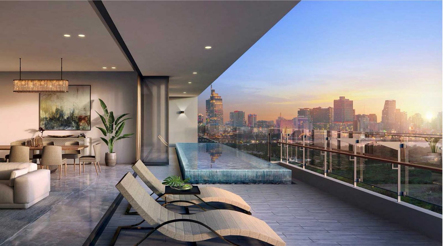 Với ban công kính dài rộng, căn hộ sở hữu tầm nhìn toàn cảnh Sài Gòn, chiêm ngưỡng khung cảnh hoàng hôn, đón những làn gió mát lành. Ban công còn được bố trí hồ bơi để các gia chủ có thể tận hưởng cuộc sống đẳng cấp tại đây. Các căn hộ The River Thủ Thiêm được bàn giao với đầy đủ nội thất cơ bản như hệ thống điều hòa không khí, nội thất bếp, nhà tắm.