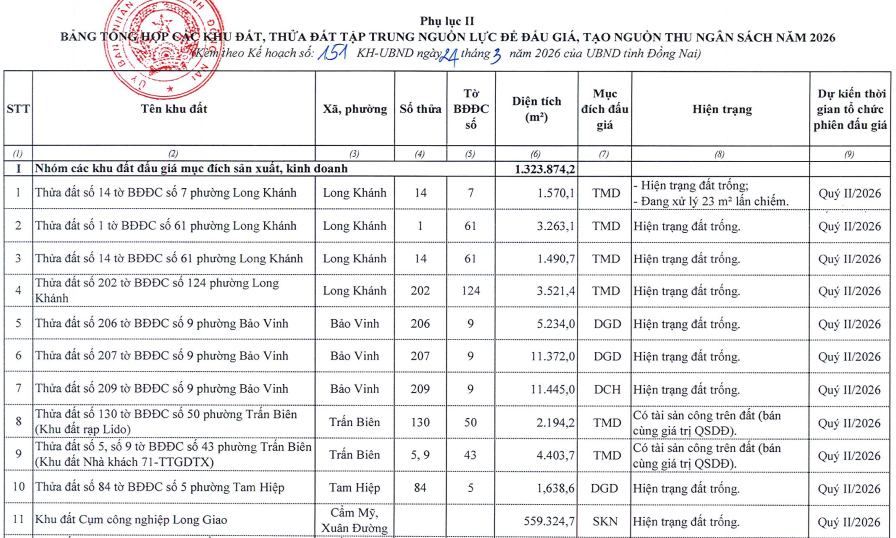 Theo Kế hoạch số 157/KH-UBND ngày 24/3/2026 của UBND tỉnh Đồng Nai, tỉnh sẽ tập trung nguồn lực tổ chức đấu giá quyền sử dụng đất đối với 73 khu đất, thửa đất (thuộc Phụ lục II) với tổng diện tích khoảng 324,5 ha, nhằm tạo nguồn thu ngân sách nhà nước năm 2026.