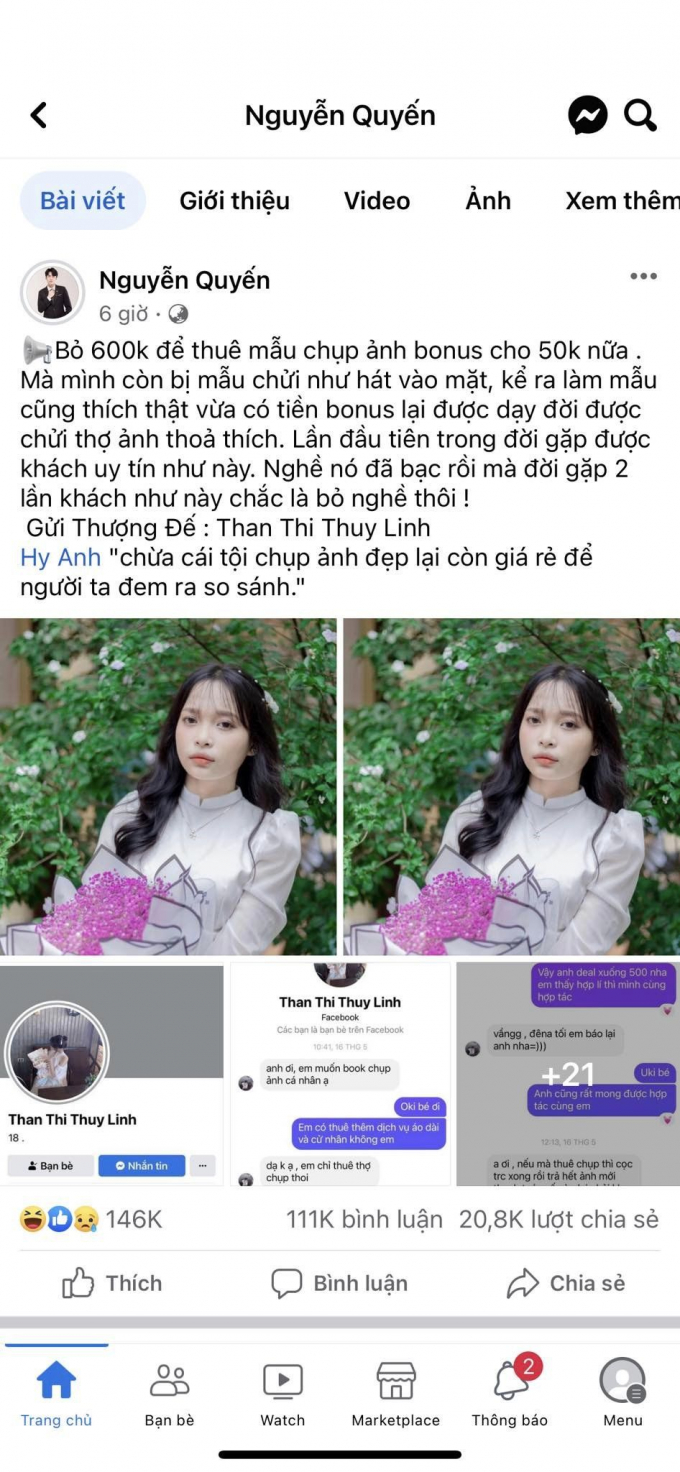 Tưởng chừng mọi chuyện đã kết thúc nhưng L. tiếp tục lấy ảnh của Q. so sánh với những nhiếp ảnh gia khác, cho rằng chi phí chụp ảnh đắt nhưng chất lượng ảnh không tốt. Nữ sinh L. tiếp tục dùng từ ngữ nặng nề để chỉ trích chất lượng ảnh.