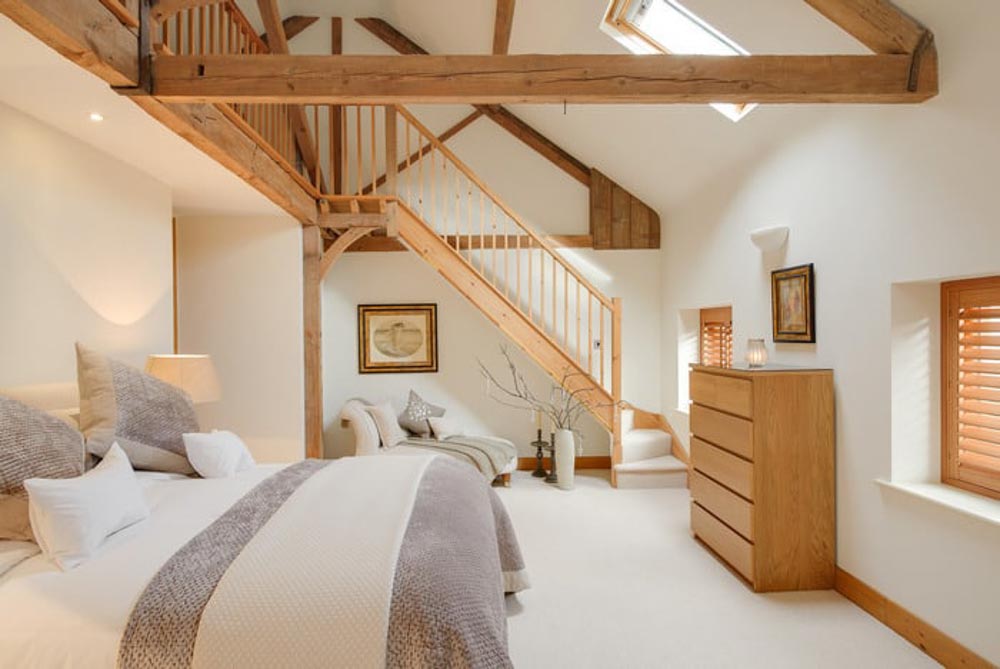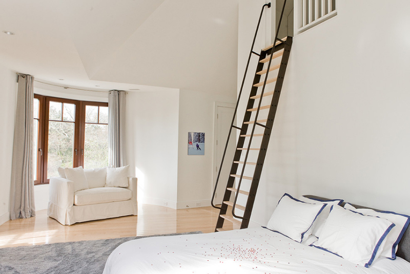 Thiết kế phòng ngủ có gác lửng tích hợp phòng ngủ đã tận dụng tối ưu về không gian khi bố trí thêm phần không gian trên gác xép làm thêm một phòng ngủ, vừa tiện lợi, vừa là điểm nhấn của phòng ngủ lớn. Với loại cầu thang dẫn lên gác lửng, hãy chọn kích thước nhỏ gọn nhưng vẫn bảo đảm về sự chắc chắn và an toàn.