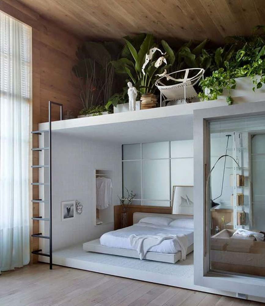 Thiết kế phòng ngủ có gác lửng kết hợp cây xanh đã thay đổi suy nghĩ của phần đông mọi người về một căn phòng ẩm thấp, thiếu sáng và không đẹp mắt. Kiểu thiết kế này đã tận dụng căn gác làm thành một vườn cây tươi tốt, trở thành nơi thư giãn rất lý tưởng.