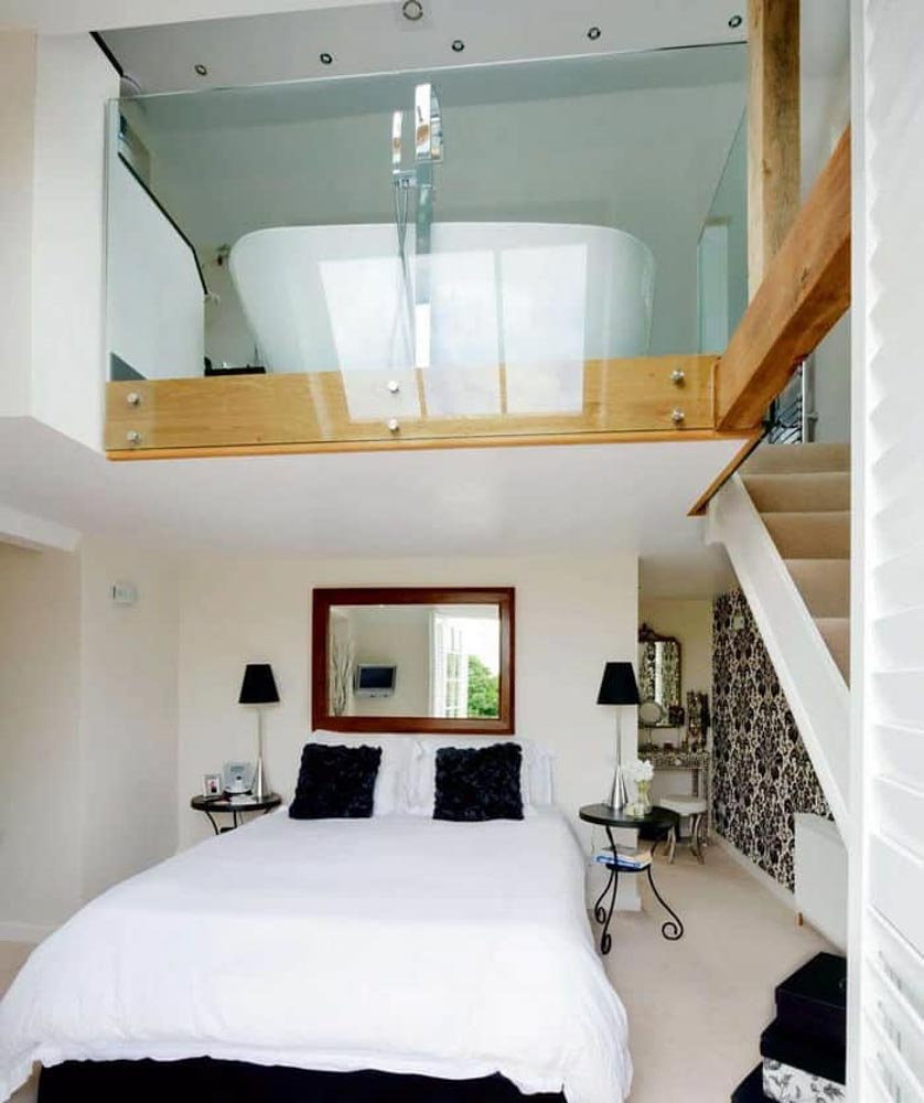Thiết kế phòng ngủ có gác lửng kết hợp nhà tắm đã khơi gợi lên sự sáng tạo hiếm có trong thiết kế. Không gian gác lửng đã được cải tạo khéo léo, trở thành khu vực tắm rửa vừa tiện nghi vừa hiện đại thông qua việc lắp đặt bồn tắm sứ cao cấp và xây lan can bằng kính cường lực.