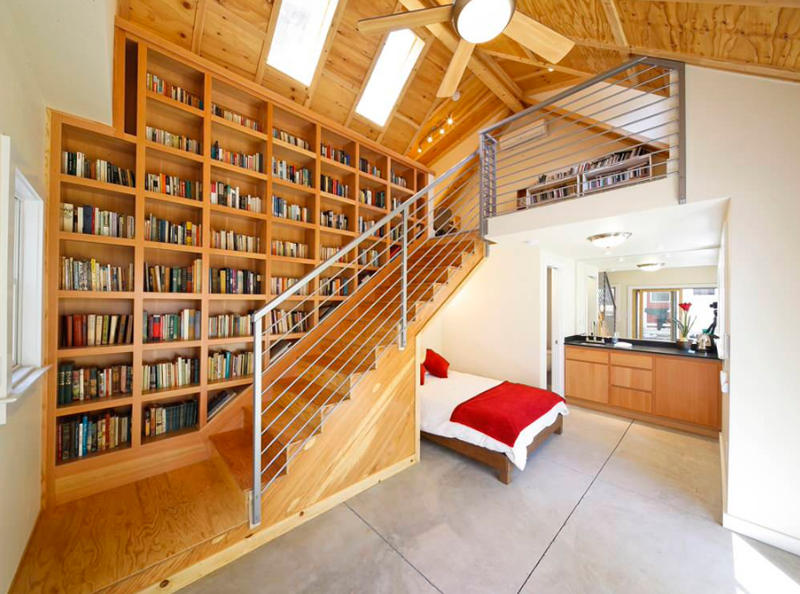 Thiết kế phòng ngủ có gác lửng với giá sách trang trí đã giúp tiết kiệm được diện tích đáng kể cho căn phòng. Một sự kếp hợp hoàn hảo “3 trong 1”. Lúc này, kệ sách “khổng lồ” nằm ngay cạnh cầu thang có tác dụng như một phụ kiện điểm tô cho không gian trở nên ấn tượng và thu hút hơn.