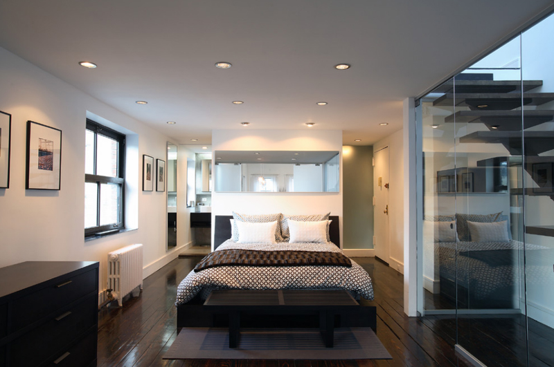 Thiết kế phòng ngủ có gác lửng ngăn cách bằng kính tuy tạo ra sự tách biệt bởi tấm kính, nhưng nhìn chung tổng thể vẫn không bị rời rạc, nhờ sự phối hợp màu sắc uyển chuyển làm toát lên vẻ sang trọng, tiện nghi.