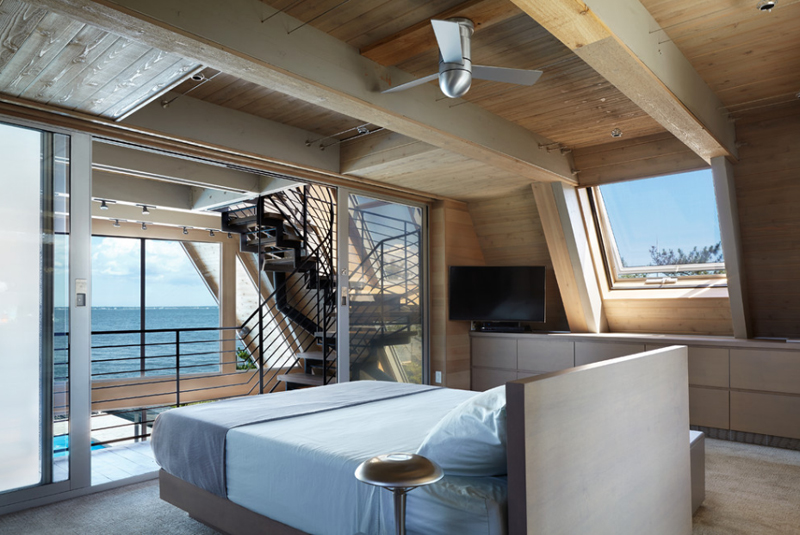Thiết kế phòng ngủ có gác lửng diện tích rộng sẽ tích hợp được cả phòng ngủ và phòng tắm vào cùng một không gian để thuận tiện cho việc nghỉ ngơi, thư giãn. Cầu thang phía bên phải hiện diện như một nét chấm phá, dẫn dắt sự liền mạch từ tầng dưới lên tầng trên, tuy thiết kế đơn giản nhưng vẫn có sức hút riêng.