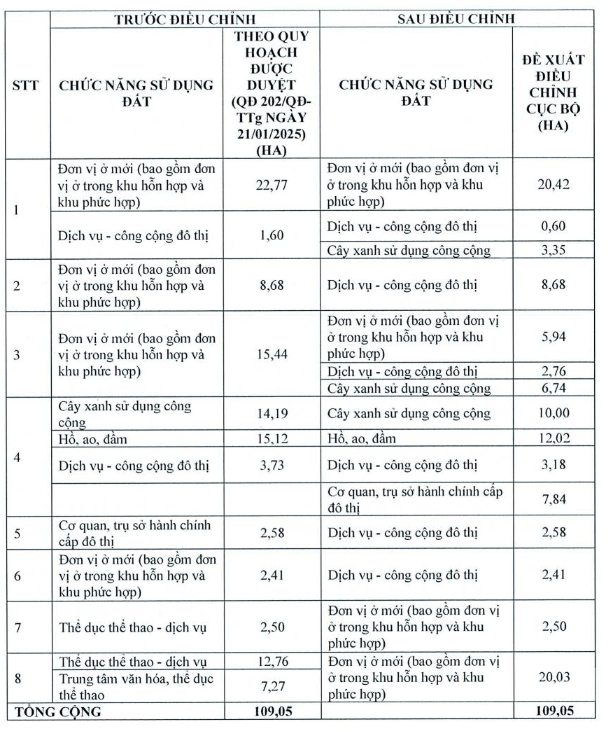Bảng cân bằng sử dụng đất sau điều chỉnh cho thấy: đất cơ quan hành chính tăng từ 2,58 ha lên 7,84 ha; đất dịch vụ công cộng đô thị tăng từ 5,33 ha lên 20,21 ha; cây xanh công cộng tăng từ 14,19 ha lên 20,09 ha. Đất đơn vị ở và hồ nước giảm nhẹ để nhường chỗ cho các công trình trọng điểm, nhưng tổng quy mô dân số và hạ tầng không thay đổi, tránh gây quá tải.