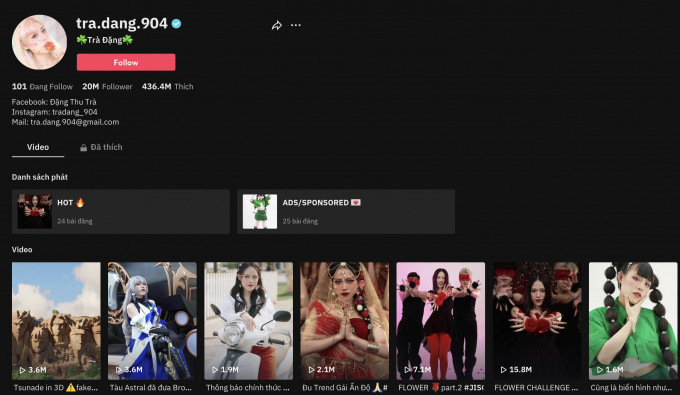 Với 6 năm hoạt động chăm chỉ trên TikTok, bắt đầu từ con số 0 nay Trà Đặng đã trở thành một trong những TikToker sở hữu lượng follow khủng nhất Việt Nam.