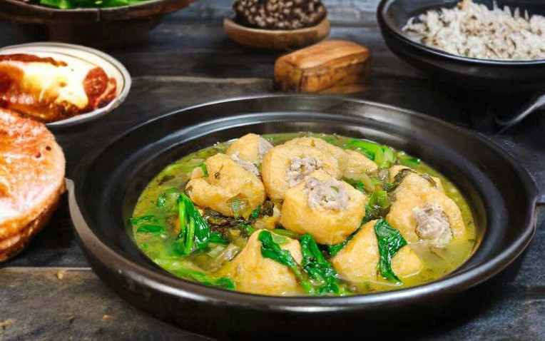 "Canh đậu phụ nhồi nhịt nấu rau cải và dưa chua" là một món ăn rất ngon, đáng ăn trong tiết trời mưa lạnh. Nguyên liệu chính gồm 4 loại thực phẩm: Đậu phụ chiên, thịt băm, dưa chua và rau cải. Đậu phụ sau khi chiên vàng thì nhồi thịt băm để khéo léo kết hợp với các nguyên liệu còn lại. Món ăn được nấu cùng với dưa chua và rau cải tươi mát để tạo thành món canh ngon, thanh mát. Đậu phụ chiên sẽ thấm đẫm nước dùng và càng thêm đậm đà. Vào ngày mưa lạnh, húp một ngụm canh vừa ngọt thanh vừa chua chua rồi ăn cùng các nguyên liệu thì bao nhiêu cơm cũng hết.