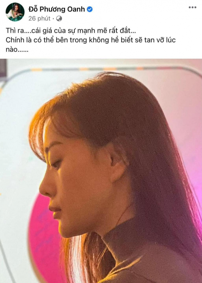 Gần đây, Phương Oanh cũng gây chú ý với dòng trạng thái chia sẻ đầy tâm trạng: "Thì ra cái giá của sự mạnh mẽ rất đắt. Có thể bên trong không hề biết sẽ tan vỡ lúc nào". Không ít người cho rằng nữ diễn viên đang ngầm ám chỉ mối quan hệ gây tranh cãi với Shark Bình, ẩn ý về sự tan vỡ trong cuộc tình của cả hai. Trước sự phản ứng mạnh mẽ của dư luận, Phương Oanh có động thái xóa hình ảnh và cả dòng trạng thái dễ gây tranh cãi này.