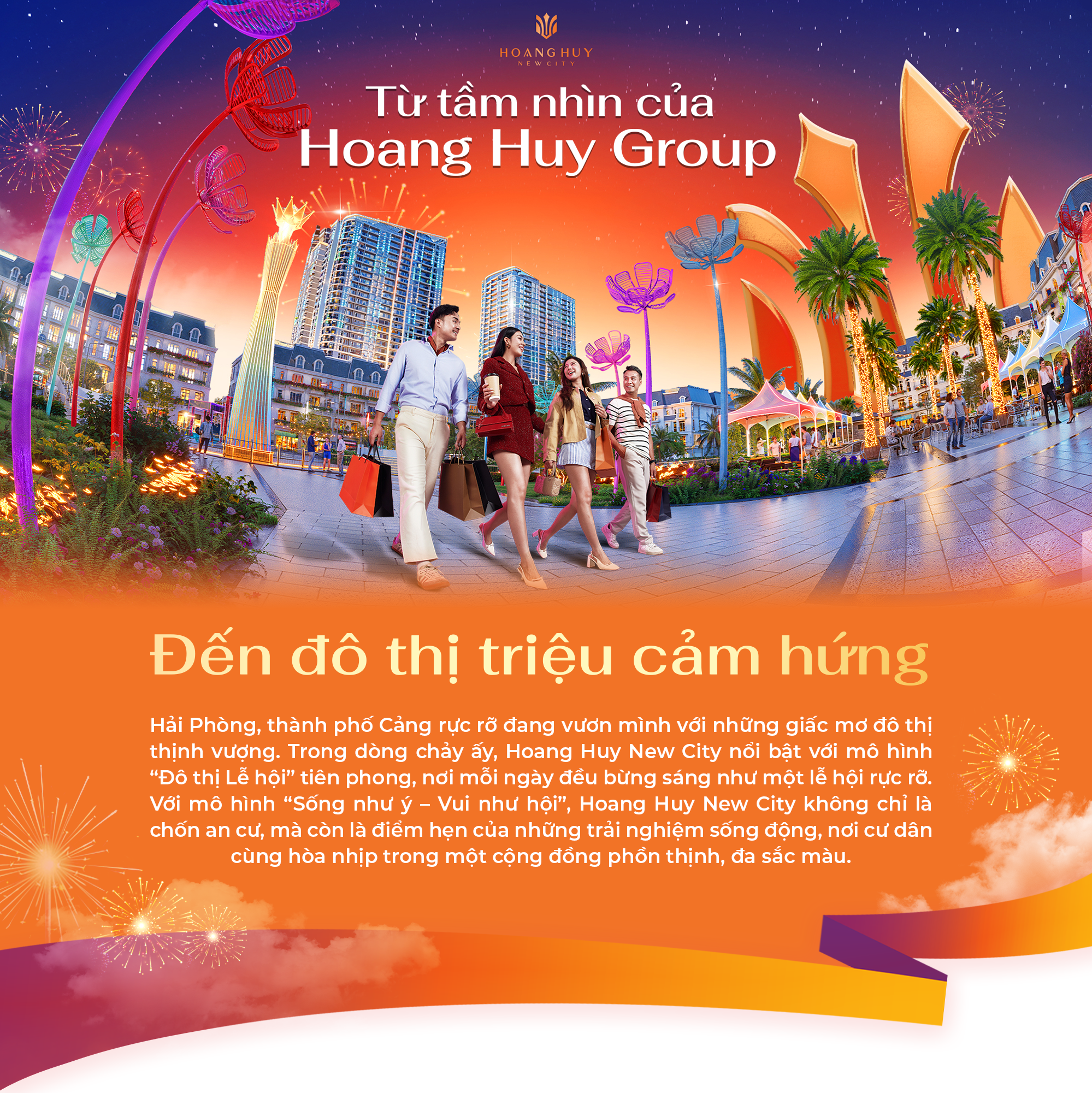 Hơn cả một dự án bất động sản, "Đô thị Lễ hội" - Hoang Huy New City kiến tạo phong cách sống toàn diện: sống chất lượng - sống kết nối - sống giàu cảm xúc. Mỗi phân khu nơi đây không chỉ là chốn an cư, mà còn là không gian để nuôi dưỡng tổ ấm, bồi đắp giá trị, và khởi nguồn cho những giấc mơ an lành. Đây cũng là nơi thế hệ trẻ tự do bộc lộ cá tính, gieo mầm sáng tạo và tận hưởng hơn 300 tiện ích từ công viên, phố đi bộ, hồ cảnh quan đến hệ thống giáo dục, y tế và thương mại hòa trong nhịp điệu lễ hội và chuỗi sự kiện New FEST được Hoang Huy New City tổ chức xuyên suốt vòng đời dự án.