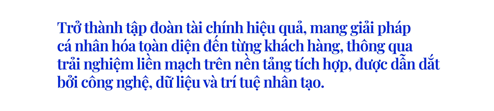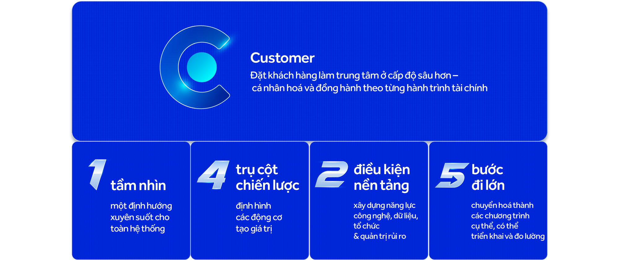 Định vị này phản ánh một cách tiếp cận xuyên suốt: hiệu quả là nền tảng cho tăng trưởng bền vững; am hiểu khách hàng là điều kiện để thiết kế các giải pháp phù hợp; trải nghiệm liền mạch là cách chuyển hoá giá trị thành sự gắn bó; và công nghệ, dữ liệu, trí tuệ nhân tạo là nền tảng để mở rộng những điều đó ở quy mô lớn.