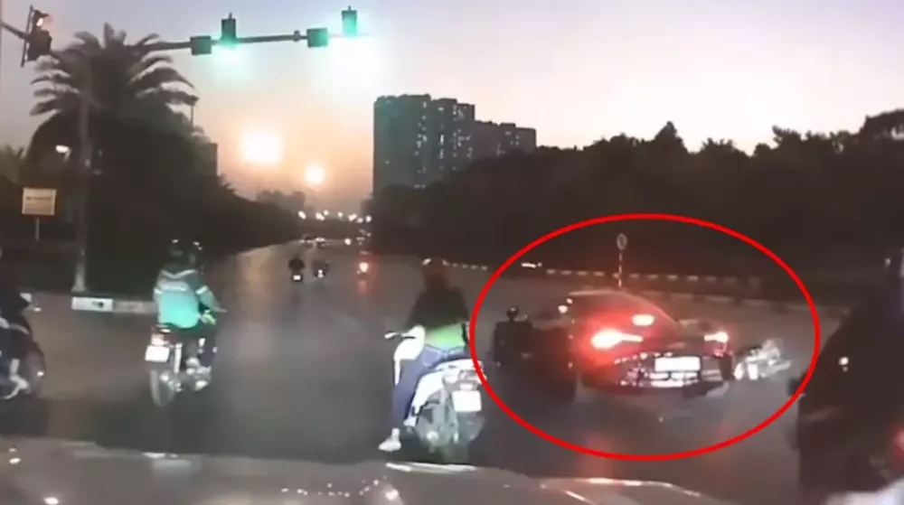 Lúc này, khi đèn tín hiệu vừa bật sang màu xanh, chiếc siêu xe đắt tiền đã nhanh chóng được tài xế cho lăn bánh qua ngã tư, tuy nhiên, vừa chạy đến giữa giao lộ thì bất ngờ bị 1 chiếc xe máy, do nam thanh niên chưa rõ lai lịch chạy từ hướng bên phải lao đến, tông thẳng vào bên sườn.