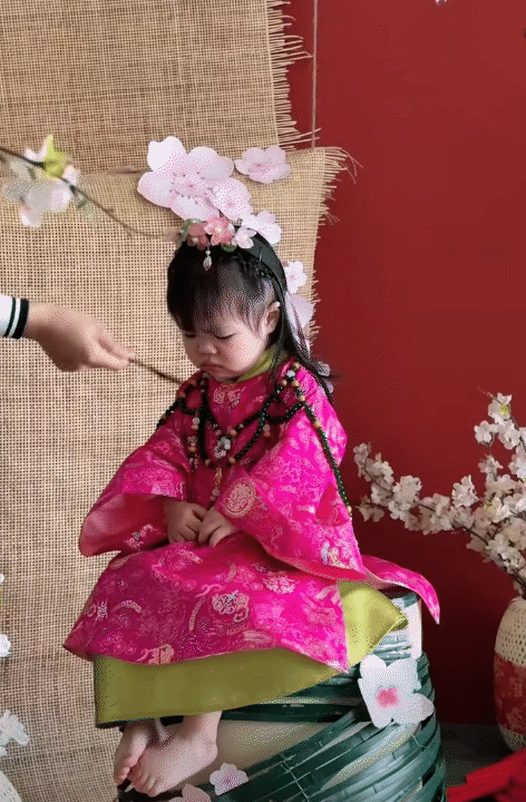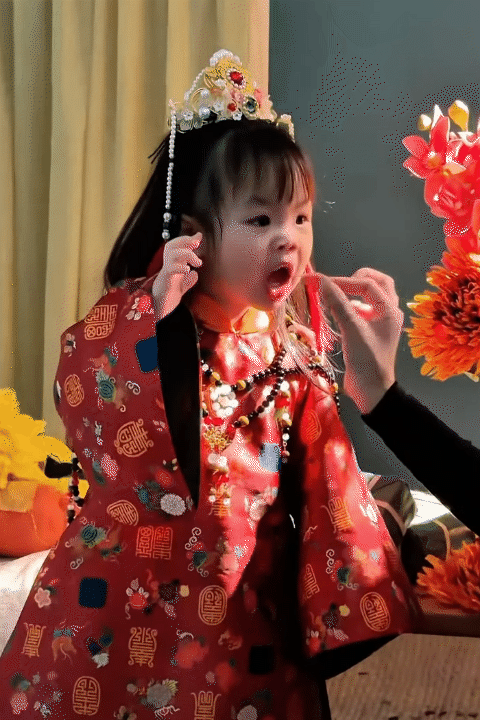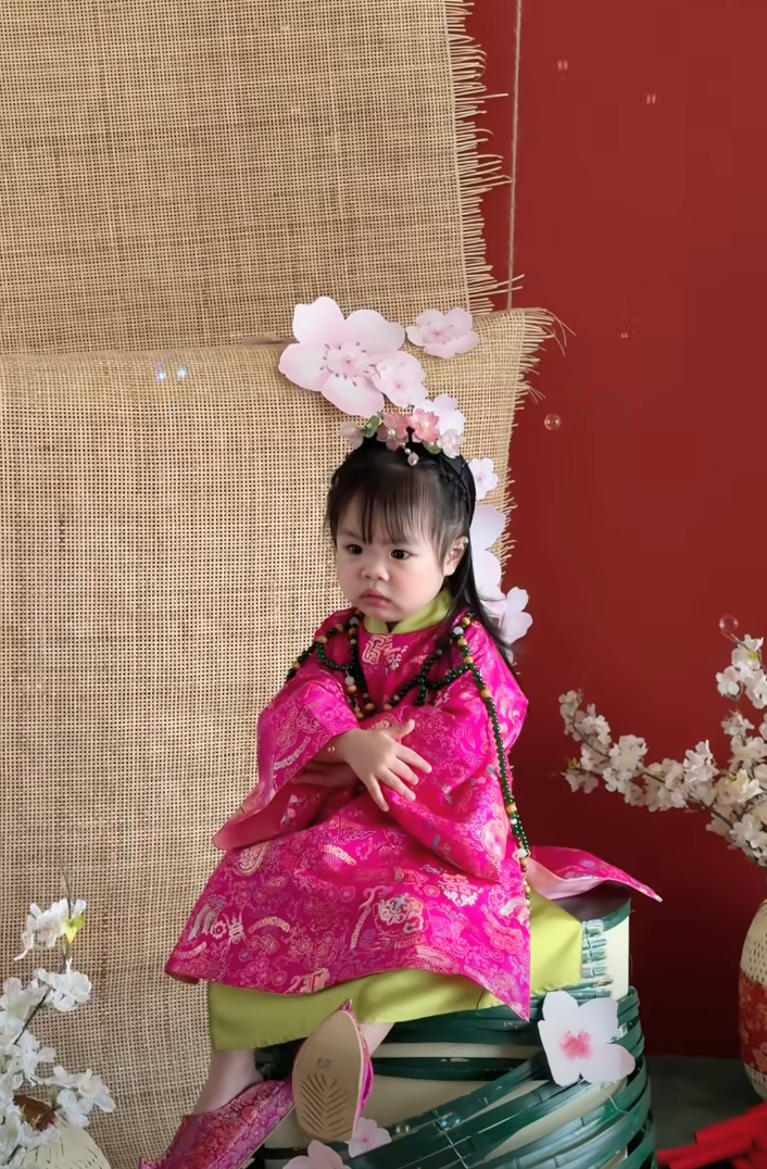 Thế nhưng điều khiến dân tình không thể nhịn cười lại không nằm ở trang phục mà chính là biểu cảm của bé Ting Ting. Không tạo dáng bánh bèo hay cười tươi như mong đợi, cô nhóc lại liên tục lộ vẻ mặt "khó ở", hờn dỗi... khi thì cau mày, lúc lại bĩu môi cực mạnh, đúng kiểu "mẹ thích là được, con không quan tâm".