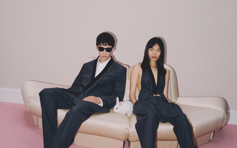 Âu phục cách tân là điểm giao thoa tinh tế giữa di sản Nhật Bản và chuẩn mực may đo phương Tây. Những bộ đồ hai mảnh mang cấu trúc kimono được làm mới bằng len pha sợi lurex kẻ sọc, vừa hiện đại vừa thể hiện sự tôn kính dành cho Kenzo Takada. Chi tiết cổ áo satin hay nút thắt dây lấy cảm hứng từ trang phục truyền thống Nhật Bản thay thế khuy cài thông thường, tạo nên vẻ trang trọng nhưng phá cách, xóa nhòa ranh giới giữa lễ phục và thời trang ứng dụng.