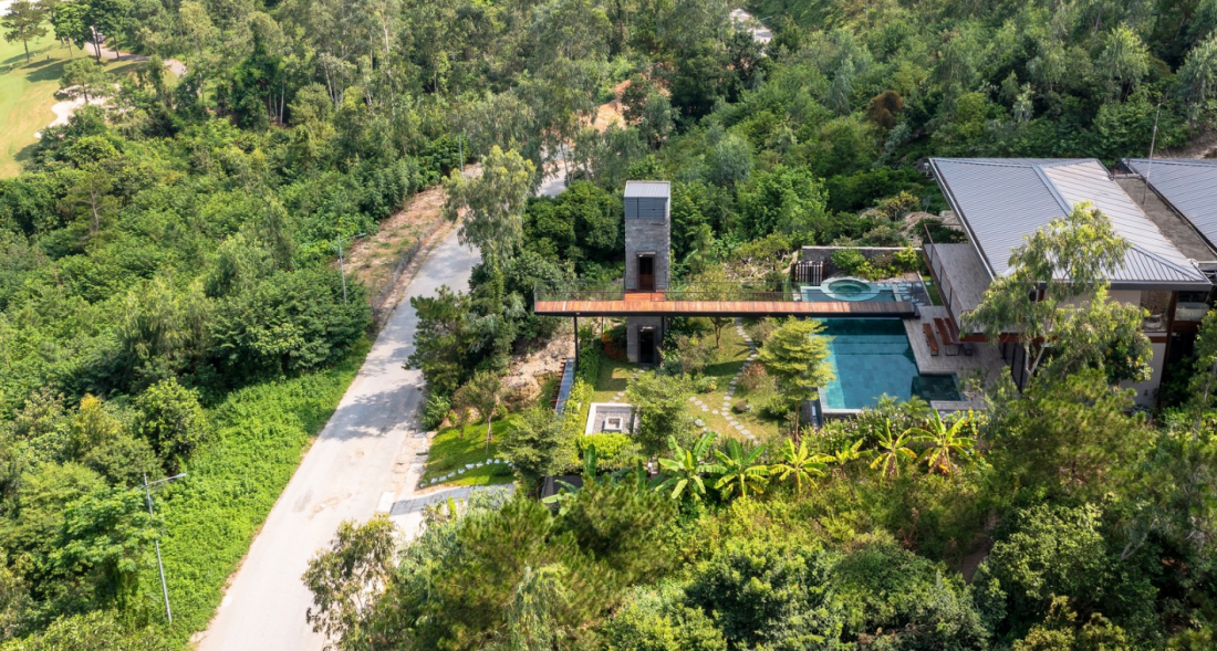 Khối thang máy riêng kết nối trực tiếp với ngôi nhà chính qua một cây cầu thép tạo thành hành trình đi qua khu vườn, hồ bơi, sân trước và đến ngôi nhà.