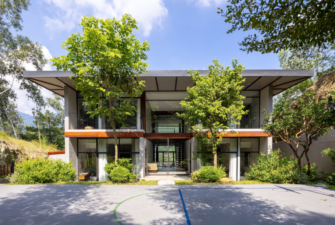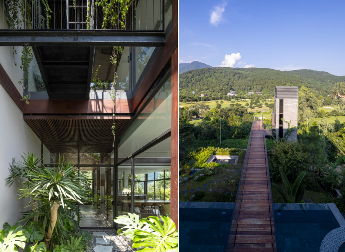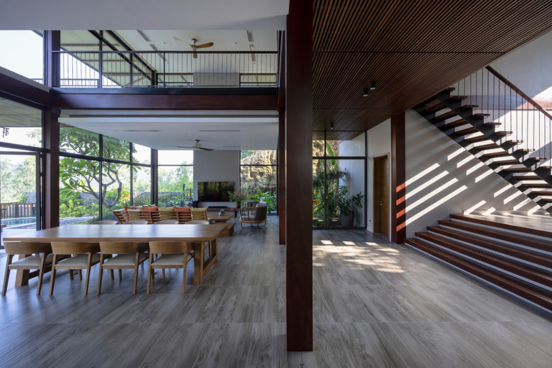 Gỗ và mái hiên mở rộng được lấy cảm hứng từ không gian kiến trúc truyền thống Việt với hình ảnh các hàng cột và không gian đối xứng. Trục giao thông chính được đặt trung tâm, kết nối sân trước với phía sau.
