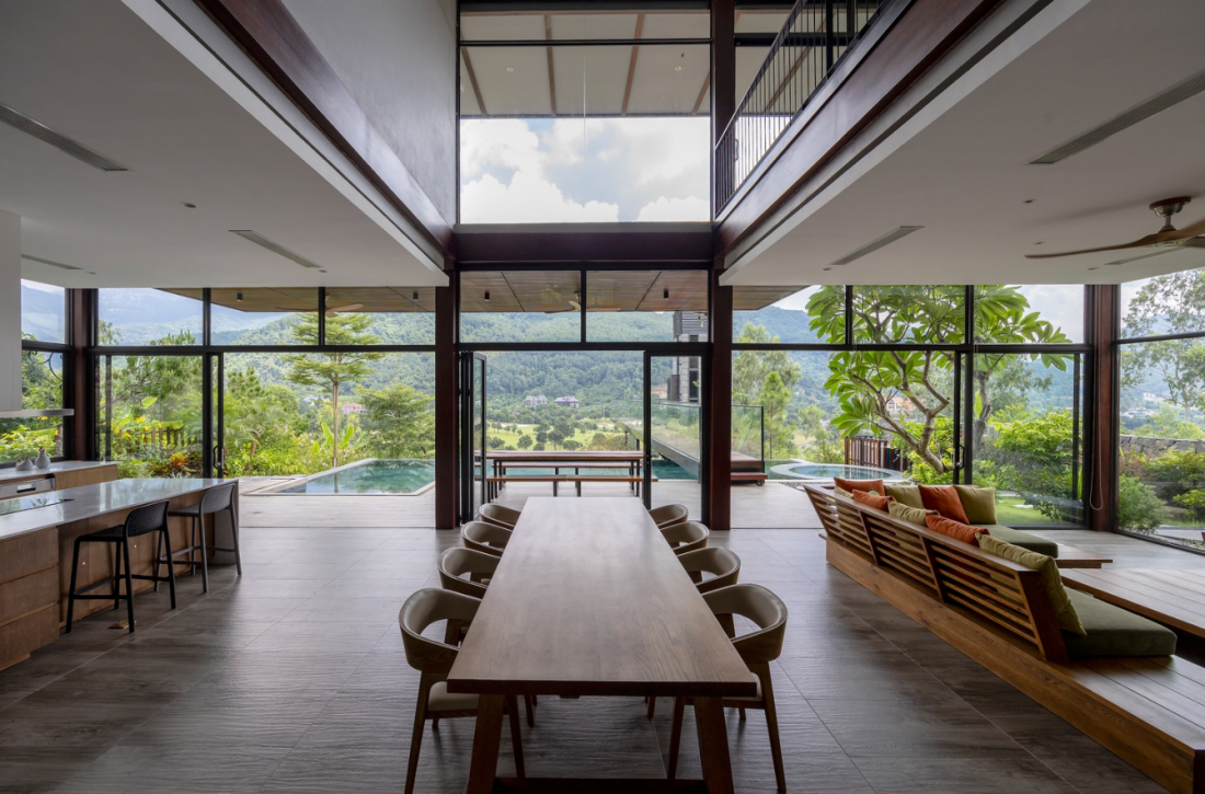Phòng khách và phòng ăn thiết kế mở, hệ cửa kính trượt bản lớn giúp không gian trở nên rộng rãi, thoáng đãng, đặc biệt dù đứng góc nào cũng phóng tầm nhìn toàn cảnh xung quanh.