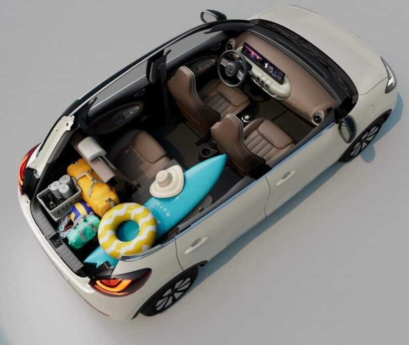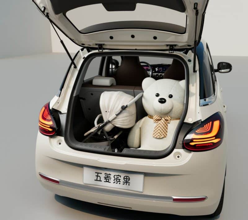 Không gian để hành lý của xe điện Wuling Bingo 2023 rất rộng, điều này đã được hãng ngụ ý bằng việc để một con thú nhồi bông cực lớn và một chiếc xe đẩy trẻ em đã được xếp lại trong khoang hành lý. Ngoài ra, Wuling cũng sẽ bán một chiếc ghế ô tô được thiết kế đặc biệt cho băng ghế sau của Bingo dành cho gia đình nào lo lắng không có chỗ cho con nhỏ mình ngồi.