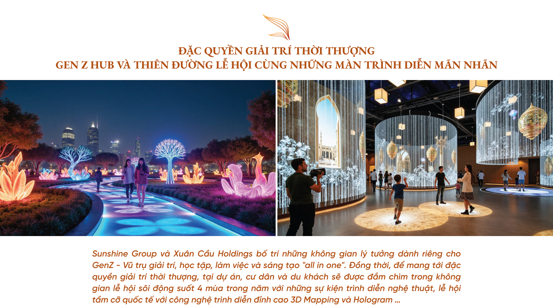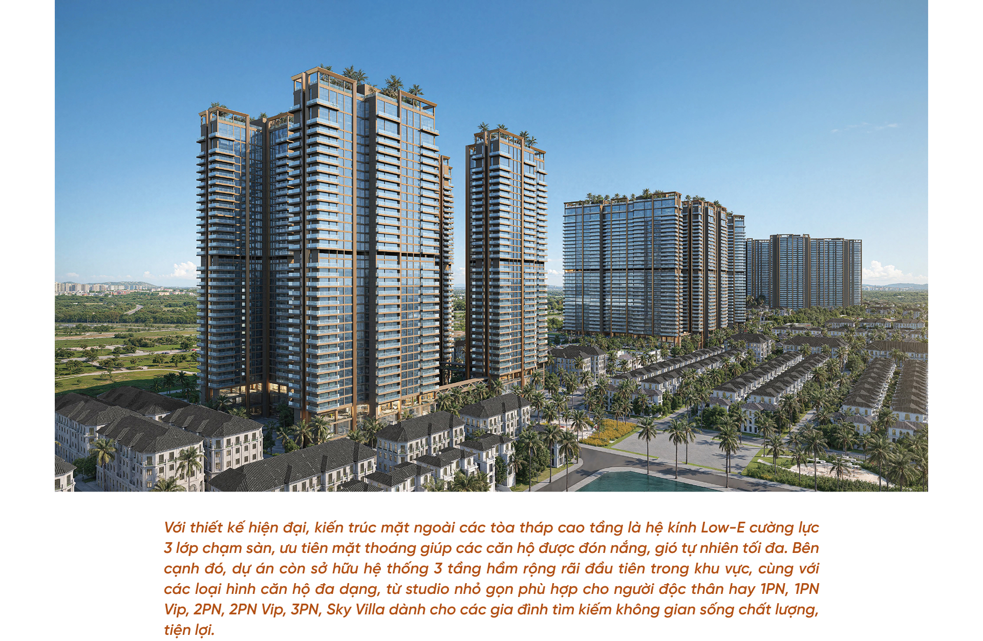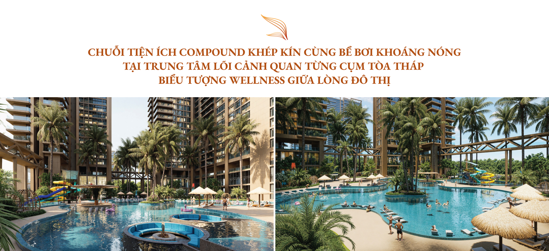 Mỗi cụm toà tháp vươn mình như một ốc đảo khép kín, với kiến trúc compound hiện đại bao bọc lấy hệ tiện ích đặc quyền, từ hệ thống tầng thương mại khối đế với đầy đủ loại hình thương mại dịch vụ, giải trí thời thượng, GenZ Hub… Đặc biệt, tại lõi cảnh quan trung tâm của các cụm tháp là bể bơi khoáng nóng rộng lớn, một ‘tiểu resort’ giữa lòng nội khu, nơi cư dân tận hưởng 365 ngày thư thái, tái tạo thân – tâm – trí trong làn nước tinh khiết. Bao quanh là hệ cảnh quan xanh mát, vườn dạo bộ, không gian thể thao và thư giãn ngoài trời, góp phần đưa dự án trở thành biểu tượng sống wellness giữa lòng đô thị.