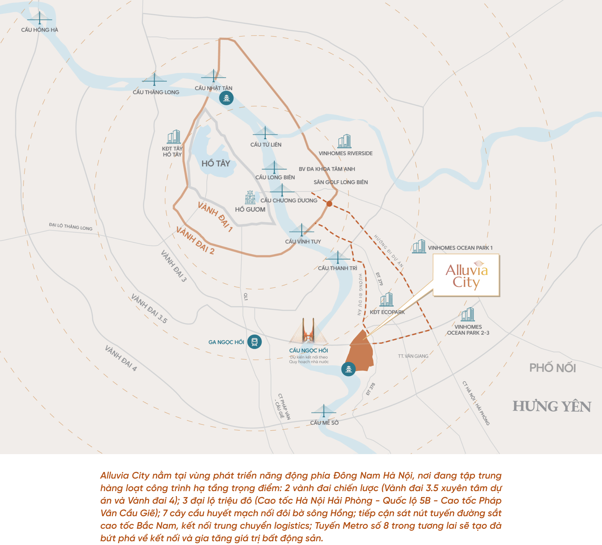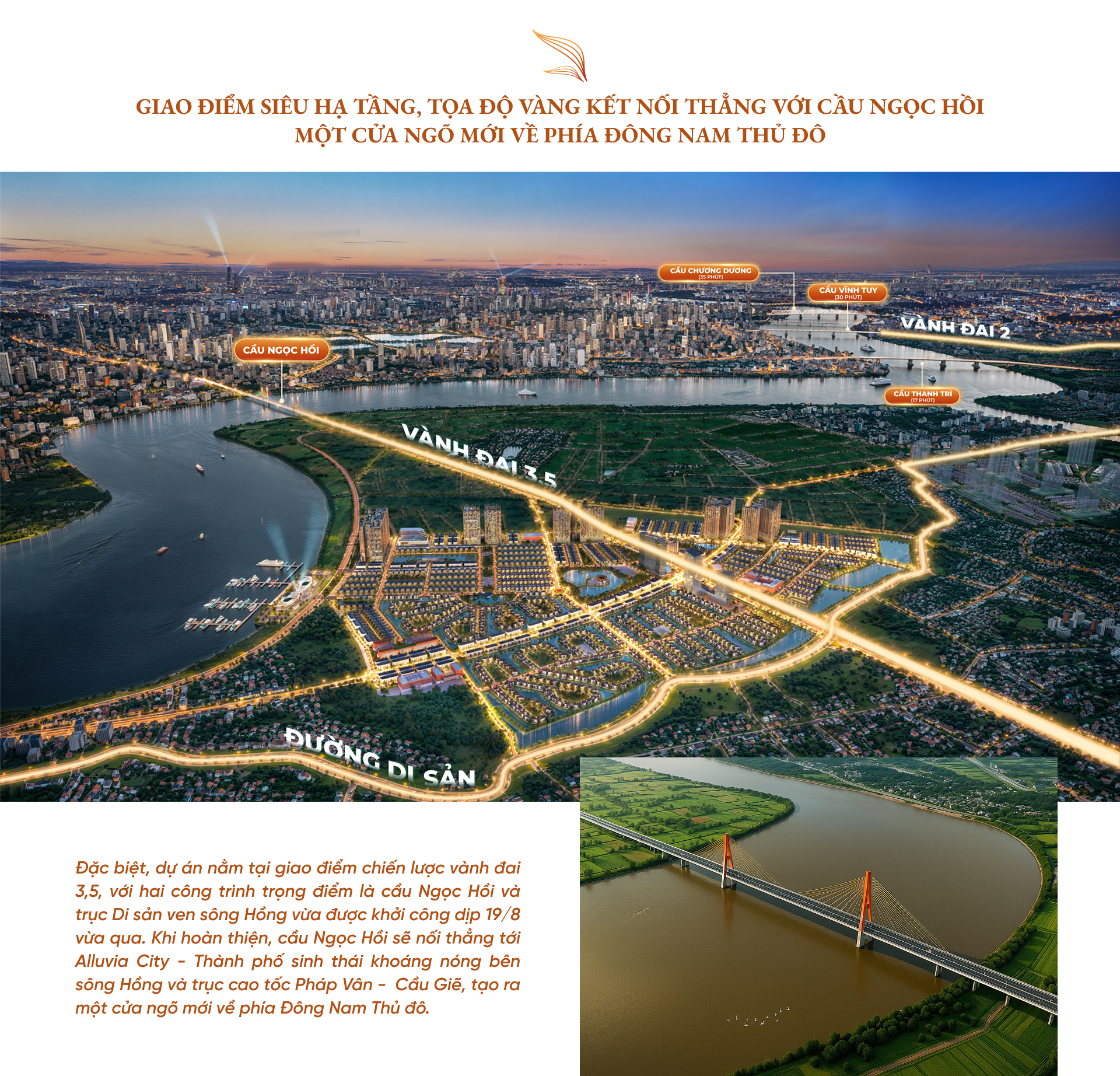Có thể thấy Alluvia City hội tụ “thiên thời” từ quy hoạch sông Hồng và “địa lợi” nhờ vị trí chiến lược cùng nguồn khoáng nóng quý giá của thiên nhiên, vừa là nơi an cư chất lượng cao, vừa là trung tâm kinh tế - du lịch mới đầy tiềm năng tại cửa ngõ Thủ đô.