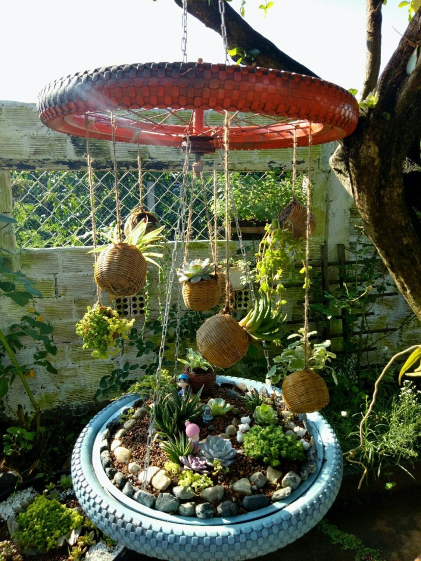 Một khu vườn nhỏ cực xinh với chiếc bánh xe, lốp xe cũ cùng với vài món đồ thủ công.