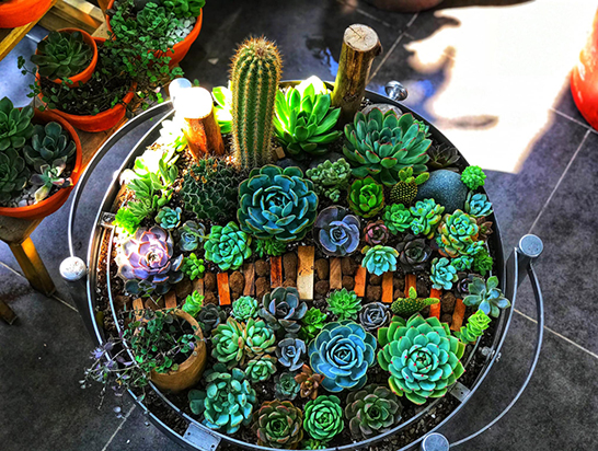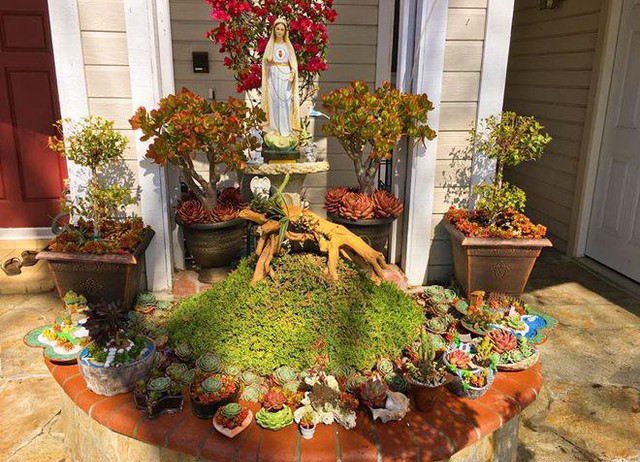 Những chậu cây tiểu cảnh bằng sen đá trang trí cho không gian sân vườn thêm sinh động.