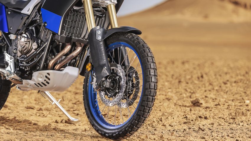 Hướng đến là mẫu xe chuyên địa hình nên Yamaha Tenere 700 có hệ thống treo hành trình dài. Cặp phuộc trước hành trình ngược có kích thức 43 mm cùng hành trình 210 mm trong khi giảm xóc đơn sau có hành trình 200 mm, đi kèm là bộ vành nan 21 inch ở trước và 18 inch phía sau như xe cào cào enduro. Mặc dù sở hữu trang bị chuyên địa hình nhưng Yamaha cho biết Tenere 700 vẫn có khả năng đi đường trường cực tốt, tương tự như xe touring, vì vậy nói rằng Tenere 700 là một chiếc Adventure Touring cũng không hề sai.